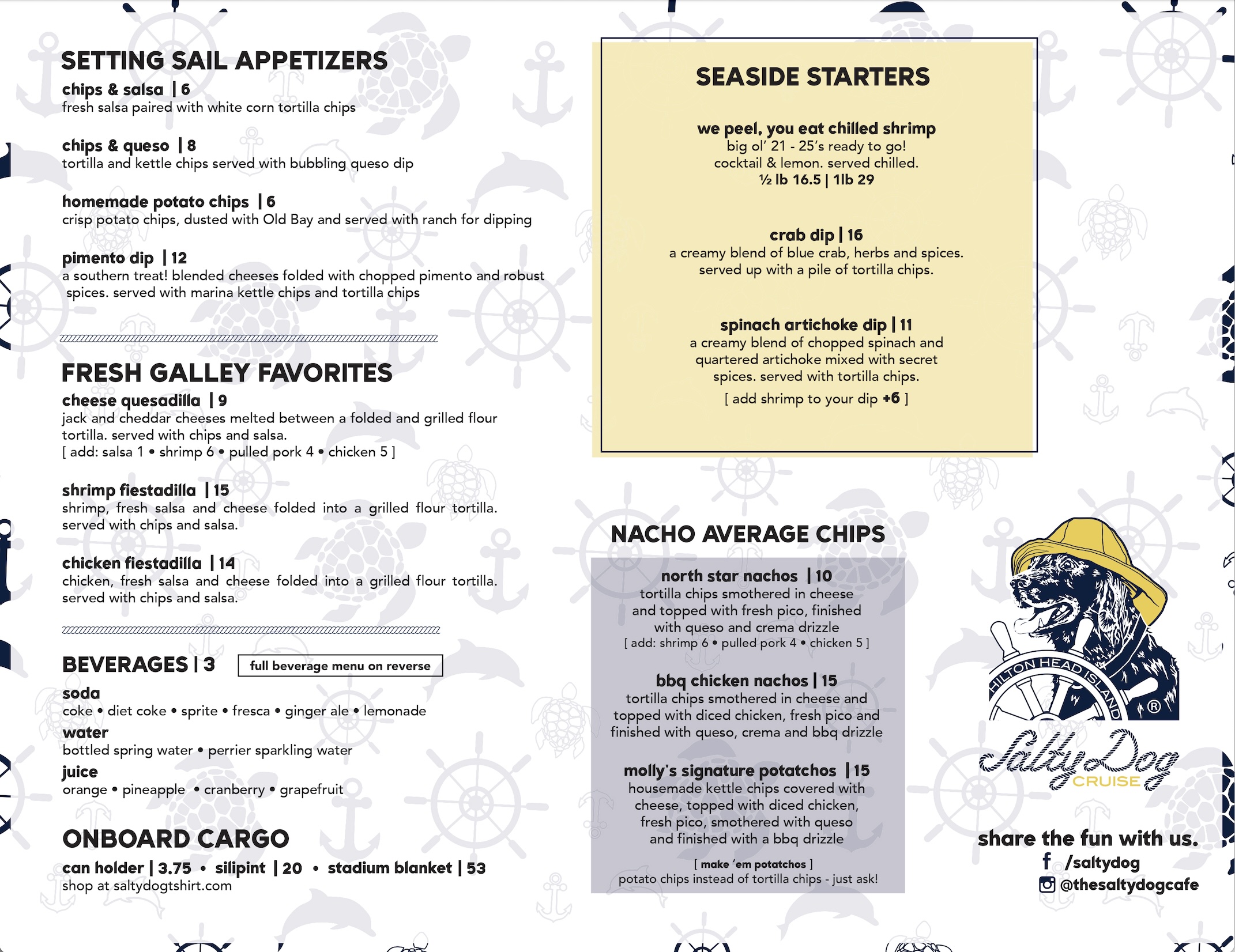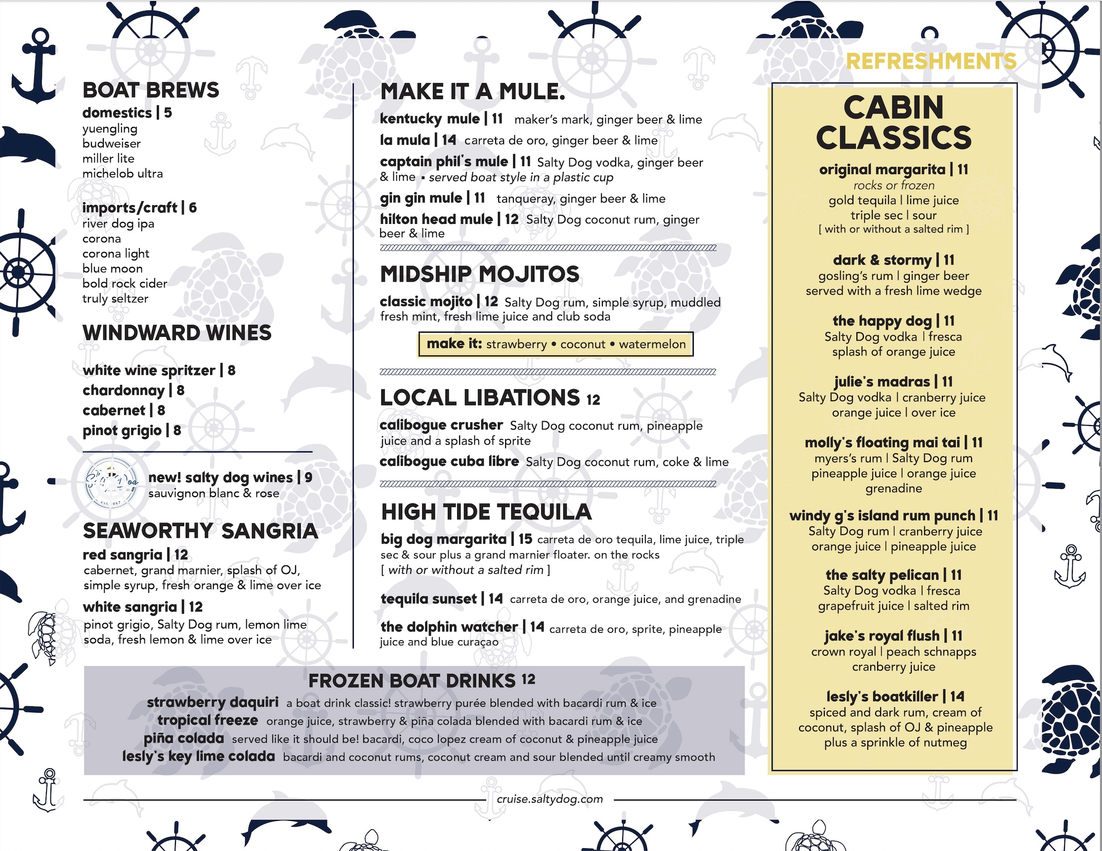 CAN I PURCHASE FOOD AND DRINKS? The Salty Dog Cruise offers a full cash (and credit / debit card) bar and galley for your dining enjoyment. Please check